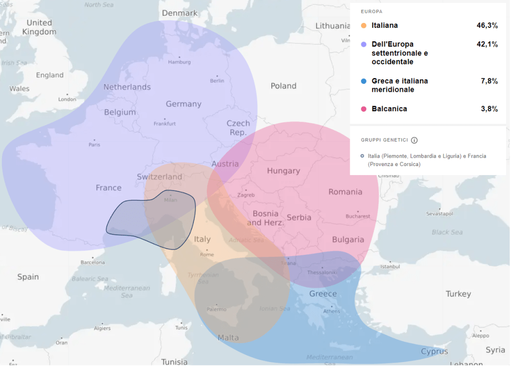 La voglia di esplorare la mia storia famigliare mi ha portato a sottopormi all’analisi del DNA: un semplicissimo test finalizzato a conoscere i gruppi etnici e le regioni geografiche da cui provengo. Un modo inedito di viaggiare e di scoprirmi di tanti luoghi che mi ha davvero emozionata. Il risultato è una coloratissima mappa rappresentante la stima delle etnie di provenienza e i miei gruppi genetici di riferimento.
